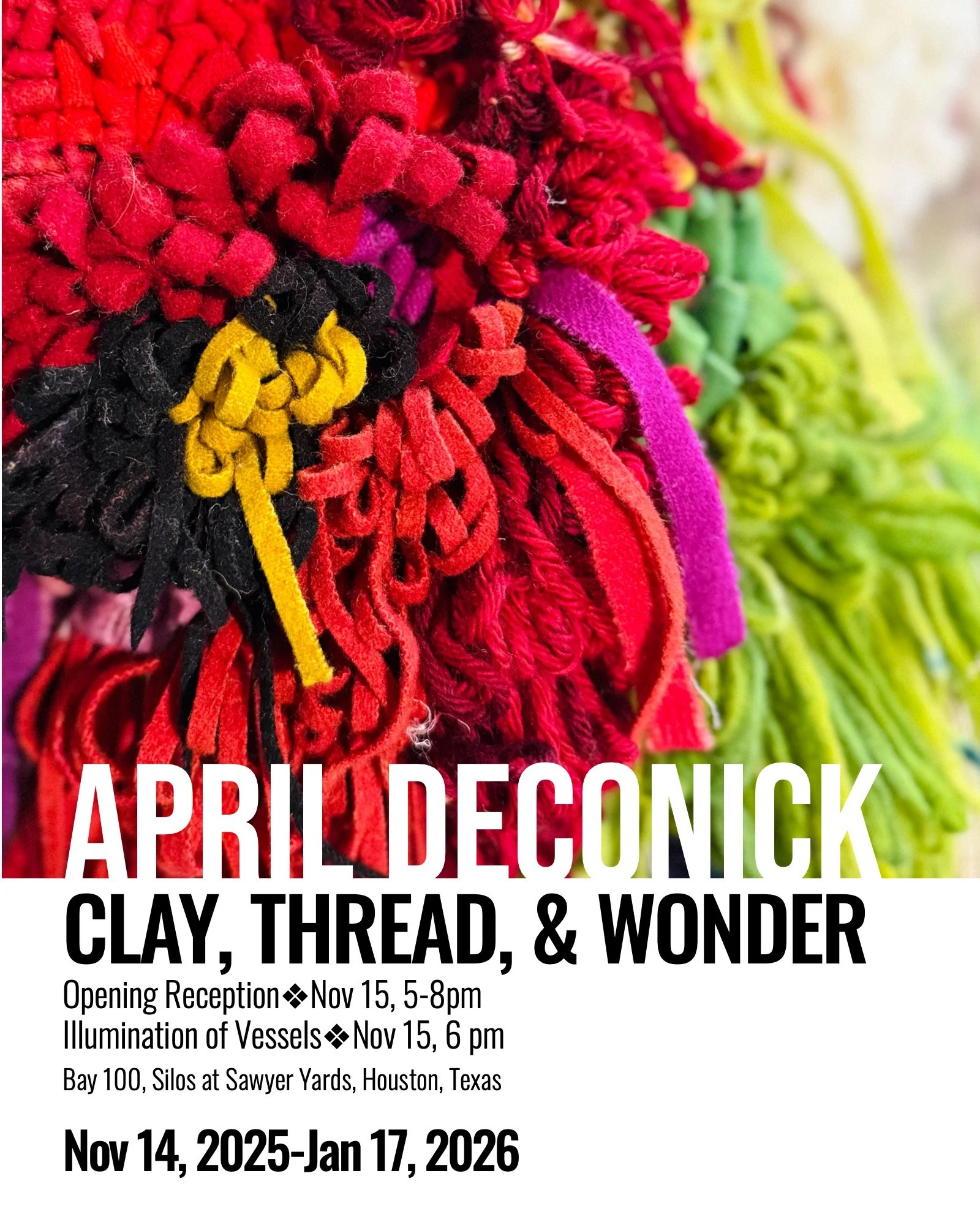 As an artist, DeConick works in clay, fiber, and paint, treating her materials not as tools but as collaborators. Her pieces emerge through an intuitive, physical process, shaped by curiosity, improvisation, and the joy of discovery. “I was like a child sticking my thumbs in clay, dashing glaze with abandon, tearing fabric randomly, and enjoying the wonder of what will happen if…” The exhibition features hooked weavings, vessels, furniture, and wall compositions. Each piece explores the intersection of the haptic and the aesthetic, using the tactility of fiber and the textured surfaces of clay to engage the senses and evoke wonder. Her sustainable artworks, crafted from wool and earth, invite reflection on how we shape ourselves—and are shaped—through making, becoming, and caring for one another and the planet we share.
