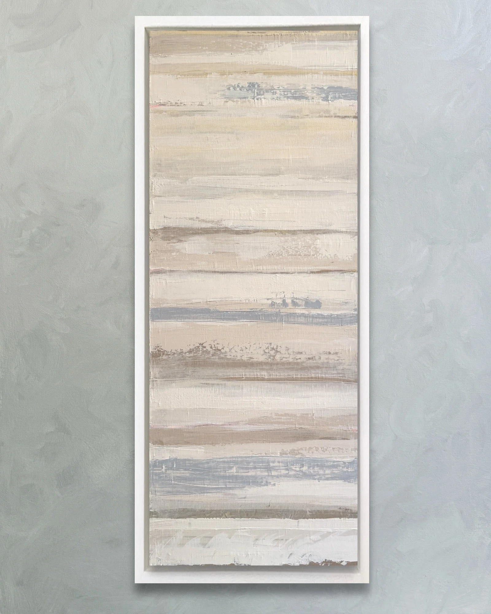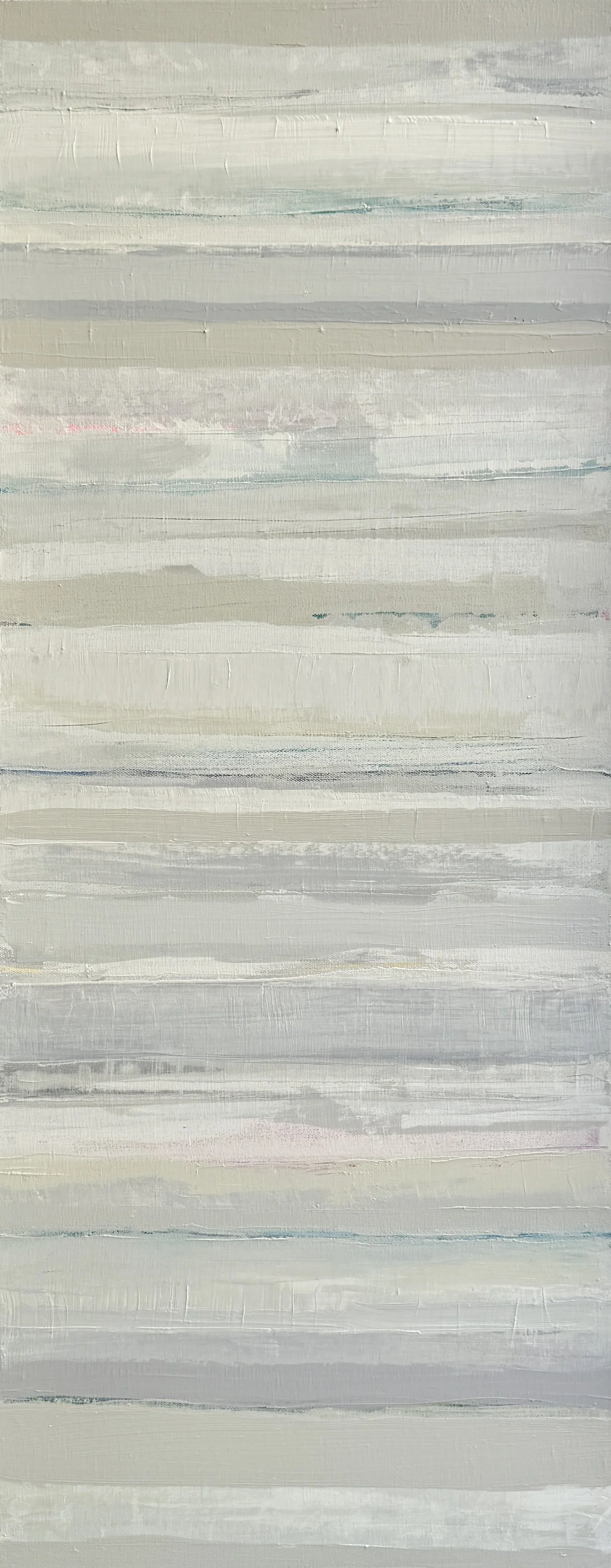 Layers of neutral tones shift subtly, revealing glimmers of color beneath. Each work features edges upon edges, forming a succession of horizons that both conceal and reveal. The series evokes moments of wonder suspended between the seen and the unseen.