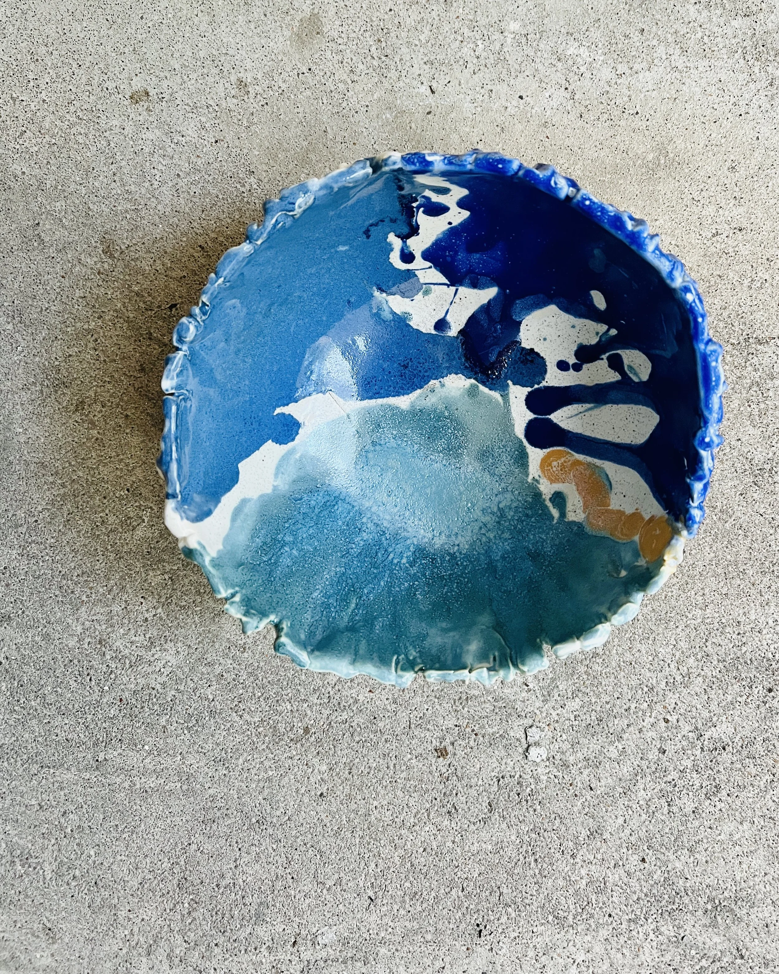 Once formed, I layer glazes using a mix of techniques—painting, splashing, dipping, and pouring—until rich, flowing patterns emerge. The result is a surface alive with movement and contrast, both inside and out.