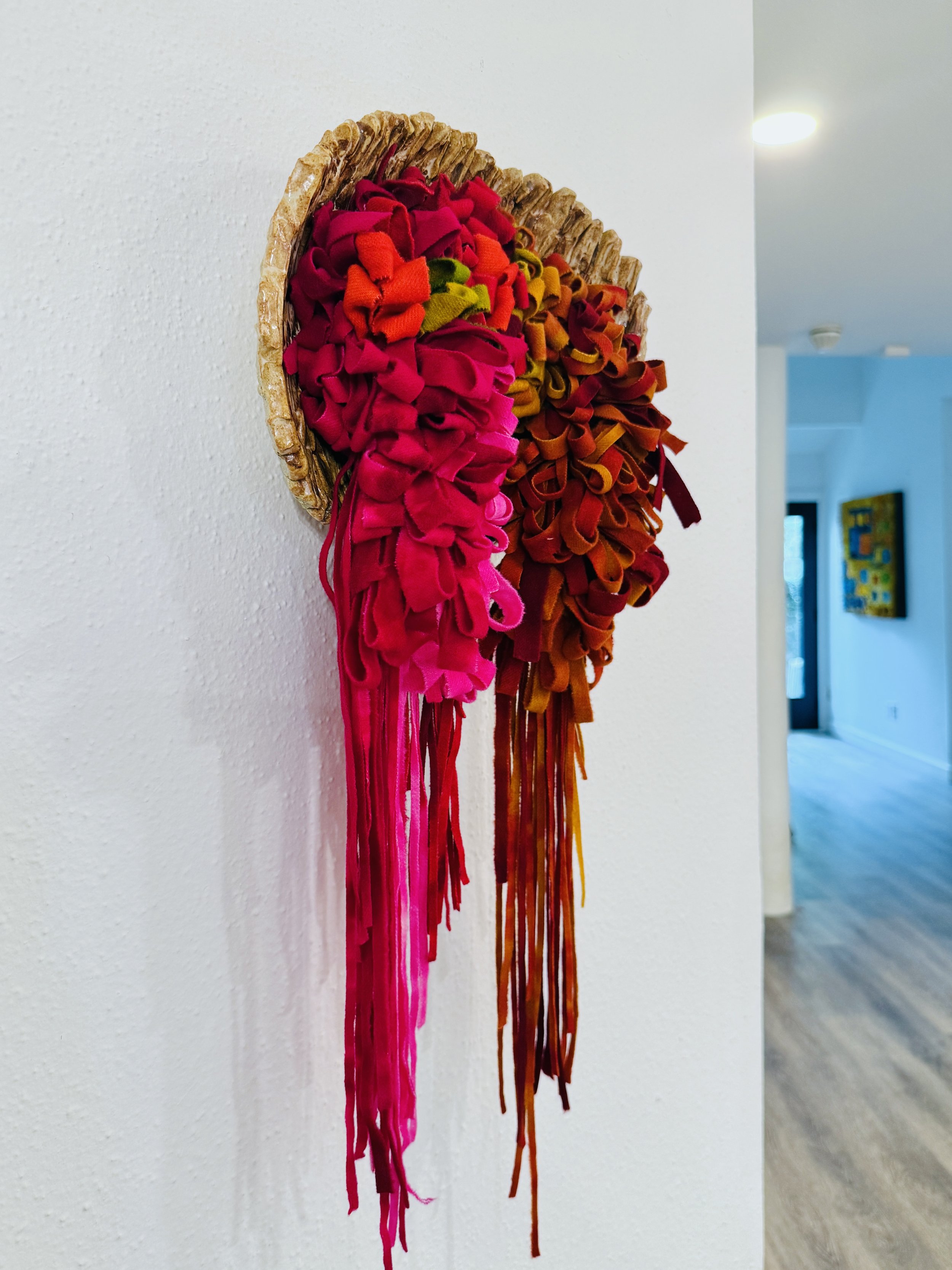 Each Wall Cascade begins with natural materials—wool, yarn, linen, cotton, and clay. I hand-dye, hook, knot, and weave the fibers, working intuitively. No patterns, no plans—just color, texture, and flow guiding the process. The result is vibrant, joyful, and alive with movement.
